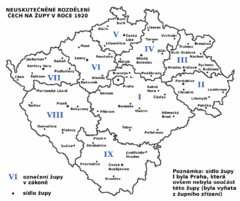 Roku 1920 byl přijat zákon o župním členění Československa, který byl však realizován pouze na Slovensku a Podkarpatské Rusi. V Čechách, na Moravě a ve Slezsku se však proti němu zvedla vlna nevole, a tak v těchto zemích nevstoupil v platnost. Na jeho základě měly být Čechy rozděleny na 9 žup a území Prahy, přičemž měla být i nadále důsledně respektována historická zemská hranice Čech a Moravy, ovšem země by jako správní celky byly zrušeny.