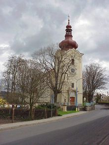 Kostel z roku 1579 stojí na okraji obce nad labským údolím.