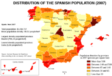 K 1. lednu 2008 obývalo Španělsko 46 063 511 obyvatel;[1] průměrná hustota zalidnění činila 91,2 obyvatele na km², což je mírně pod průměrem EU. Rozložení obyvatelstva je silně nerovnoměrné: zatímco pobřežní oblasti a ostrovy jsou velmi hustě zalidněné, centrální Španělsko je téměř pusté (kastilská provincie Soria má pouze 9 obyv./km²), trpící dlouhodobým stárnutím obyvatelstva a jeho odchodem zejména do Madridu, v jehož aglomeraci žije 14 % obyvatel země.