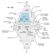 Diagram QAPF – křemeny (Q), alkalické živce (A), plagioklasy (P) a foidy (F) a podíl tmavých minerálů (M).