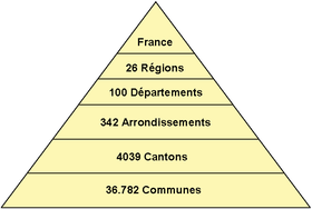 Departmenty se dále rozdělují na 342 arrondisementů, do kterých se nevolí žádné zastupitelstvo a mají ale pouze smysl pro zařazení a administraci. Arrondisementy se člení na 4 039 kantonů, ale ty opět slouží jen k administraci a rozdělení voličů. Poslední článek tvoří obce, kterých je ve Francii 36 782. Obce jsou samosprávné s voleným zastupitelstvem (obecní rada).