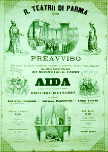 Tuto operu psal Verdi ve svých 58 letech na objednávku pro operu v Káhiře k příležitosti otevření Suezského průplavu. Aida je obvykle považována za vyvrcholení Verdiho celoživotního operního díla. První představitelkou titulní role měla být česká sopranistka Tereza Stolzová. Kvůli prusko-francouzské válce nakonec ani ona ani Verdi do Egypta neodcestovali. Světovou premiéru 24. prosince 1871 v Káhiře dirigoval Giovanni Bottesini a Aidu zpívala Antonietta Anastasi-Pozzoni. Stolzová zpívala až evropskou premiéru 8. února 1872 v divadle La Scala. Tereza Stolzová pak podepsala smlouvu na třicet představení v Káhirské opeře v sezóně 1873–1874 za astronomický honorář 150 000 franků. Mimo to se jí dostalo poct od samotného chediva Isma'ila Paši.
