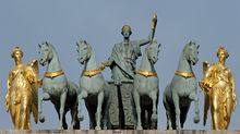 Kvadriga Bronzových koňů Konstantina I. na vrcholu oblouku je kopií spřežení z baziliky sv. Marka v Benátkách, které armáda ukořistila v Itálii roku 1798 a které se roku 1815 vrátilo zpět do Benátek. Autorem kopie je François Joseph Bosio.