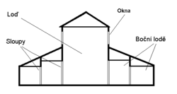 - orientální, která měla vchod (nebo vchody) na delší straně a její interiér byl rozdělen na střední loď a průchod, který vedl okolo ní,