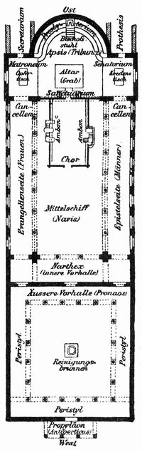 - řecká, která měla vchod na jedné z kratších stran s apsidou naproti.