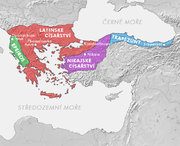 Některé části Byzantské říše zůstaly pod vládou řeckých vládců. Nejúspěšnějším nástupnickým státem bylo Nikájské císařství s hlavním městem Níkaiou v Malé Asii, kam utekli členové byzantské aristokracie a vyššího pravoslavného kléru. Zdejší panovníci z rodu Laskaridů prováděli úspěšnou hospodářskou politiku a pomalu začali dobývat zpět některá ztracená území. Za nově nastoupivší dynastie Palaiologů byla dobyta Konstantinopol a zakladatel dynastie Michael VIII. Palaiologos se roku 1261 stal císařem obnovené Byzantské říše. Druhým řeckým nástupnickým státem byl Epirský despotát. Tento stát se nacházel na území dnešní západní Thessálie a jižní Albánie. Zdejší vládcům se podařilo načas dobýt Soluň, avšak postupně nastal v tomto státě úpadek panovnické moci.[49] Od čtyřicátých let 13. století zde nikájští a posléze byzantští císaři začali opět prosazovat svůj vliv.[50] Posledním státem se stalo Trapezuntské císařství. Vzkvétal zde obchod a řemeslná výroba, udržovaly se kontakty s italskými námořními republikami. Trapezuntské císařství přežilo samotnou Byzanc a bylo dobyto osmanskými vojsky teprve roku 1461.