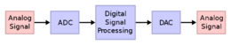 Na obrázku je typické blokové schéma zařízení využívajícího DSP. Analogový signál je nejprve převeden A/D převodníkem na digitální a v této podobě je průběžně zpracováván digitálním signálním procesorem. Zpracovaný digitální signál je D/A převodníkem zpět převeden na analogový. V mnoha zařízeních prochází signál tímto řetězcem v reálném čase, ale na některých signálech je potřeba provést tak složité a výpočetně náročné algoritmy, že to ani velmi rychlý DSP procesor v reálném čase nestihne a digitalizovaná data musí být nejprve zaznamenána do paměti a odtamtud teprve postupně zpracovávána.