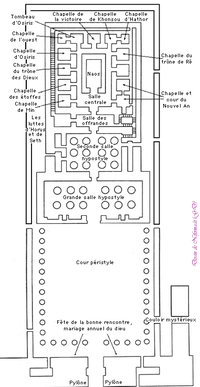 Chrám začíná velkou kamennou vstupní bránou, pylonem, který byl ozdobený vlajkovými stožáry. Žádný z těchto stožárů se sice do současnosti nedochoval, ovšem jejich přítomnost dosvědčují výklenky, které jsou v pylonech. Pylon samotný byl tvořen dvěma lichoběžníky a proto i výklenky pro stožáry byly s rostoucí výškou mělčí až splynuly s povrchem pylonu.Za pylonem se nacházelo nádvoří lemované řadou sloupů (v případě chrámu v Luxoru je nádvoří lemované dvojitou řadou sloupů). To bylo jako jediné z celého chrámu přístupno prostým lidem. Ti tam však měli přístup jen o svátcích a byl zde vynášen kultovní obraz. Za nádvořím se nalézala nejméně jedna sloupová síň. Z lidí mimo chrám sem měli přístup jen vysocí úředníci. Dál už vak mohli jen chrámoví kněží a faraon, který byl nejenom vládcem, ale zároveň i nejvyšším veleknězem všech bohů. V případě značně rozšiřovaných chrámů mohlo za hypostylem následovat další nádvoří a další hypostyl. Za hypostylem se nacházela místnost s posvátnou bárkou. Ta byla postavena na vysokém podstavci a sloužila k přepravě vyobrazení božstva při procesích nebo při návštěvě boha/bohyně jiného chrámu. Pro tyto příležtostné návštěvy měly některé chrámy mezi hypostylem a sálem s bárkou místnost s obětním stolem, kde se obětovalo bohům při návštěvě chrámu jiným božstvem. V nejzazší části chrámu stála samotná svatyně, v níž se nacházel naos, v němž byla uložena socha boha/bohyně. V některých chrámech se takovéto svatyně mohly nalézat dvě či tři, byl-li chrám zasvěcen vícero bohům. Božskému páru či dokonce triádě (božský pár + potomek). V případě zádušních chrámů bylo místo sálu s bárkou a svatyně prostor pro kultovní oběti zemřelému panovníkovi.[7]