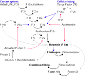 Srážení krve je složitá biochemická kaskáda procesů, v nichž každý krok navodí další pokračování sledu reakcí. Na konci této kaskády je právě vznik fibrinu. Nejprve trombin odstříhá z fibrinogenu dva řetězce, označované jako fibrinopeptid a a fibrinopeptid b. Tím se radikálně změní vlastnosti fibrinogenu, dochází k jeho aktivaci a vzniku tzv. fibrinového monomeru. Tyto monomery se jsou schopné velmi snadno spojovat do rozpustných vláknitých polymerů. V dalším kroku jsou tyto řetězce převedeny pomocí fibrin stabilizujícího faktoru (faktor XIII) na nerozpustný fibrin, tedy konečný produkt, který je schopný záplatovat místo, kde např. došlo ke krvácení.[2]