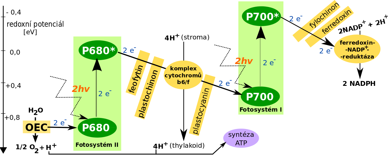 | Souhrnná rovnice: | 2 NADP+ + 2 H2O → 2 NADPH + 2 H+ + O2 | E˚ = −1,135 V |