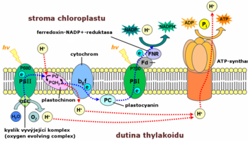 | Elektrony a vodíkové kationty se využijí k redukci: | NADP+ + H+ + 2 e- → NADPH | E˚' = −0,320 V |