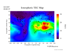 Ukázka modelu ionosférické refrakce z 12. února 2007 9:00 (JPL NASA)