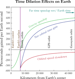 • rozdílné gravitační potenciály (Obecná teorie relativity) ve značné vzdálenosti nad Zemí, protože intenzita gravitačního pole klesá s druhou mocninou vzdálenosti (pro orbit družic 16×): hodiny se zrychlují +50×10−9%