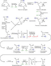 - Glukosa je za spotřeby jedné molekuly ATP fosforylována enzymem hexokinázou na glukosu-6-fosfát.