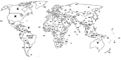 Mapa označení regionů pomocí prvního písmene kódu letiště