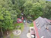 Zaparkovaná auta před restaurací na Jedlové, pohled z rozhledny
