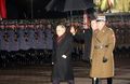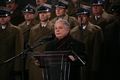 Lech Kaczyński pronáší projev. V pozadí jsou členové polské armády |