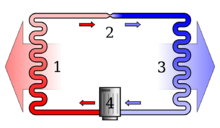 V 1. fázi jsou páry chladící látky přivedeny do kompresoru kde jsou stlačovány (a důsledkem stlačování i zahřívány). Teplý vzduch je ventilátorem hnán do venkovního prostoru. Ve 2. fázi je chladící médium o vysoké teplotě a tlaku přivedeno do výměníku — kondenzátoru, kde je ochlazováno (médium kondenzuje). Uvolněné odpadní teplo je ventilátorem odváděno do venkovního prostoru. Ve 3. fázi je kapalina transportována pod tlakem přes kapiláru nebo expanzní ventil do výměníku — výparníku (místa s nižším tlakem a vyšší teplotou), kde se rozpíná (expanduje) a tím i prudce ochlazuje. Kapalina se začne odpařovat, ohřívá se a tím odebírá teplo z prostoru výparníku. Výparník je ochlazován. Pro distribuci studeného vzduchu do místnosti slouží ventilátor, který je umístěn kolem výparníku. Poté je chladivo v plynném skupenství přiváděno do kompresoru a cyklus se opakuje.