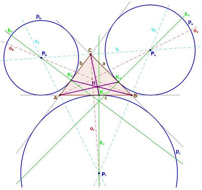 - AKa, BKb, CKc – spojnice dotykových bodů s protějšími vrcholy