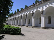 Další významnou stavbou je 244 m dlouhá kolonáda, která původně sloužila jako hlavní vstup. Je vyzdobena 46 sochami antických bohů, historických a mýtických postav v atikách a stejným počtem bust nad pilíři. Po točitém schodišti lze vystoupat na „střechu“ galerie, odkud je výhled na zahradu a přilehlé dopravní hřiště. Při pohledu shora vynikají geometrické tvary pěšin a živých plotů a centrální rotunda.