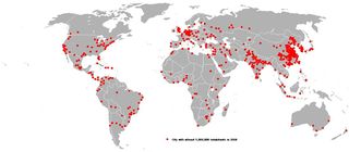 Mapka ukazuje, že velkoměsta a megapole nejsou po světě rozložena rovnoměrně, nýbrž většinou hustě nahloučena v několika málo oblastech Země. Jsou to oblasti s nějak příznivými podmínkami, kde došlo a dochází k demografickému růstu obyvatelstva, které většinou hledá obživu v blízkém okolí.