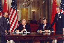 V mezinárodní oblasti Gorbačov usiloval o zlepšení vztahů a obchod se Západem. Navázal důvěrné vztahy s významnými západními politiky, např. s Margaret Thatcherovou (která kdysi poznamenala: „Mám ráda pana Gorbačova - můžeme spolu dělat byznys“), se západoněmeckým kancléřem Helmutem Kohlem a s prezidentem Spojených států Ronaldem Reganem. 11. října 1986 se Gorbačov a Reagan setkali v islandském Reykjavíku, aby spolu projednali omezení počtu jaderných raket středního doletu v Evropě. Toto jednání vyústilo v podepsání Smlouvy o likvidaci raket kratšího a středního doletu (INF) roku 1987, které výrazně snížilo mezinárodní napětí. V únoru 1988 Gorbačov oznámil stažení sovětských vojsk z Afghánistánu, které skončilo už v následujícím roce.