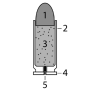 Schéma pistolového náboje: (1) projektil; (2) nábojnice; (3) střelný prach; (4) dno nábojnice (okraj); (5) zápalka.