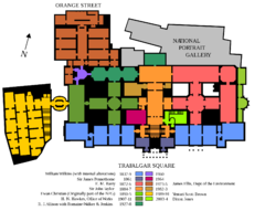 Stavbu budovy galerie zahájil roku 1837 William Wilkins. Stavba měla pouze jedno poschodí a jejímu rozšíření na sever bránily budovy chudobince a kasáren a na jih chráněná alej kostela St Martin-in-the-Fields. Nedostatek prostorů byl dále komplikován tím, že ve východní části budovy se do roku 1868 nacházela Královská akademie umění.