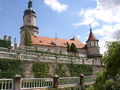 Zámek na místě starší tvrze byl zahrnut při založení do opevnění města, je však od města oddělen výrazným příkopem. Byl rozšířen během 16. století a barokně přestavěn v letech 1655-1661 podle plánů Carla Luraga. V letech 1909-1913 byl upraven podle plánů Dušana Jurkoviče pro průmyslníka Cyrila Bartoně z Dobenína. Jurkovič navrhl také originální zámeckou zahradu s dřevěnými stavbami. Zámek tvoří čtyřúhelník kolem nepravidelného dvora se středověkou kulatou věží v severním nároží a renesančními malbami a sgrafity ve dvoře. Hlavní vchod je ve směru od náměstí a tvoří jej most přes příkop a kamenný barokní portál. Před zámekm je pět soch trpaslíků od M. B. Brauna z let kolem 1720, které sem byly přeneseny z Benátek nad Jizerou v roce 1913. V zámku je řada pozoruhodných prostor s barokní štukovou i moderní výzdobou (Pavel Janák, František Kysela). Na severozápad od zámku je terasová zámecká zahrada italského stylu s dřevěnými stavbami D. Jurkoviče, které byly nedávno obnoveny. Severně od zámku, směrem k bývalé bráně, je budova bývalého pivovaru.[1]