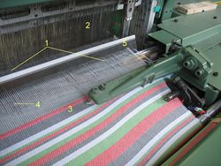 Snímek vpravo ukazuje část tkacího stroje, ve které vzniká naprostá většina přetrhů. Osnovní niti /1/ se trhají převážně mezi nitěnkami /2/ a začátkem hotové tkaniny /3/. Zarážky zastaví chod stroje okamžitě po vzniku přetrhu, obsluha musí najít konec niti, provléknout jej paprskem /5/ (v případě přetrhu před brdem i nitěnkou), nastavit chybějící kus niti a svázat oba konce dohromady. Menší část přetrhů nastává před vstupem do nitěnek, počet přetrhů útku /4/ je poměrně nízký a k odstraňování tohoto druhu poruch již existují strojní zařízení.[4]