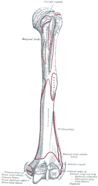 | vřetenní sval | zevní hrana pažní kosti (margo lateralis humeri) |