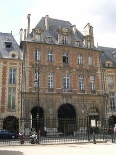 - Hôtel č. 18 nechal postavit prezident finanční komory Nicolas Chevalier de Videville, který získal parcelu roku 1605. V roce 1626 byla majitelkou Marguerite de Béthune, která nechala dům rozšířit. V roce 1659 jej koupil generální pokladník francouzského duchovenstva Adrien de Hanyvel, který roku 1684 nechal vybudovat balkón.[24]