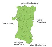 Prefektura se nachází na západním pobřeží v severní části ostrova Honšú. Je omývána vodami Japonského moře. Na severu hraničí s prefekturou Aomori, na východě s prefekturou Iwate, na jihovýchodě s prefekturou Mijagi a na jihu s prefekturou Jamagata.