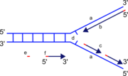 Replikační vidlice; a: templátová DNA, b: vedoucí řetězec, c: spožďující se řetězec, d: replikační vidlice, e: primer, f: Okazakiho fragment