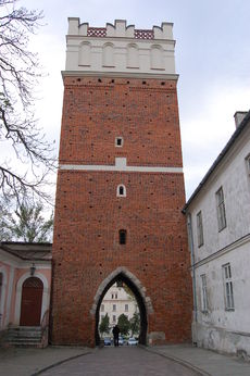 Opatowská brána – gotická vstupní brána do města ze 14. století, korunovaná renesanční atikou. Financována králem Kazimírem Veliký, jediná dochovaná. Do Sandoměře vedly čtyři brány obranných hradbách: Opatowská, Zawichowská, Lublinská, Krakovská a dvě branky (zachovala se jedna, Dominikánská, zvaná Ucho jehly).