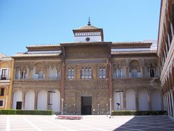 Nyní královský palác, původně maurská pevnost, ale většina z moderního Alcázaru byla postavena na ruinách maurského paláce Pedrem I. Kastilským (také známý jako Petr I. Krutý), který ho nechal postavit maurskými staviteli, proto má Alcázar islámský vzhled. Karel V. pak nechal přidat některé gotické prvky do kontrastu s mudejarským stylem (stavění v arabském stylu i po reconquistě).
