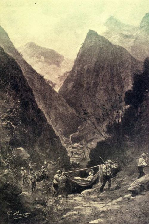 - English: An illustration from Jules Verne's (or Michel Verne's) novel "The Thompson Agency and Co" drawn by Léon Benett.