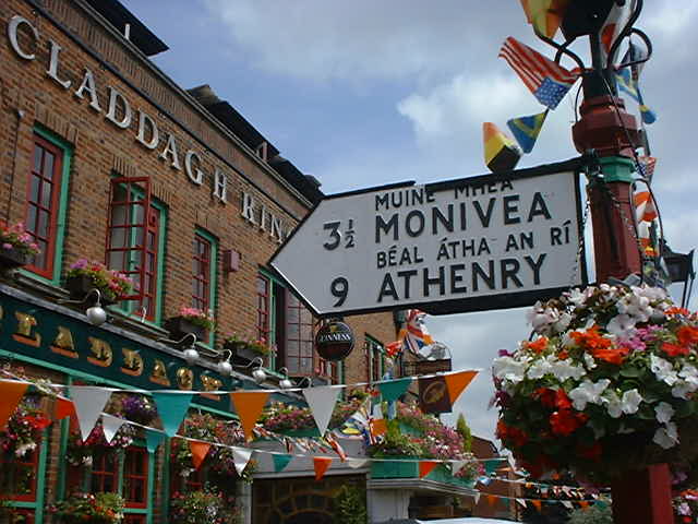 Fotografie + Description: Alledgedly this pub is 9 miles from the low-lying fields of Athenry. The sign is an authentic Irish bi-lingual road sign. It was probably stolen from Or, to be more charitable, since I recently discovered that the Republic has gone metric with its road signs, this sign may have been discarded from its original location and obtained legitimately. In fact this is the Claddagh Ring public house in Church Road, Hendon, north London near the junction with Church End at Photographed 2002 June 29 13:15 (BST)