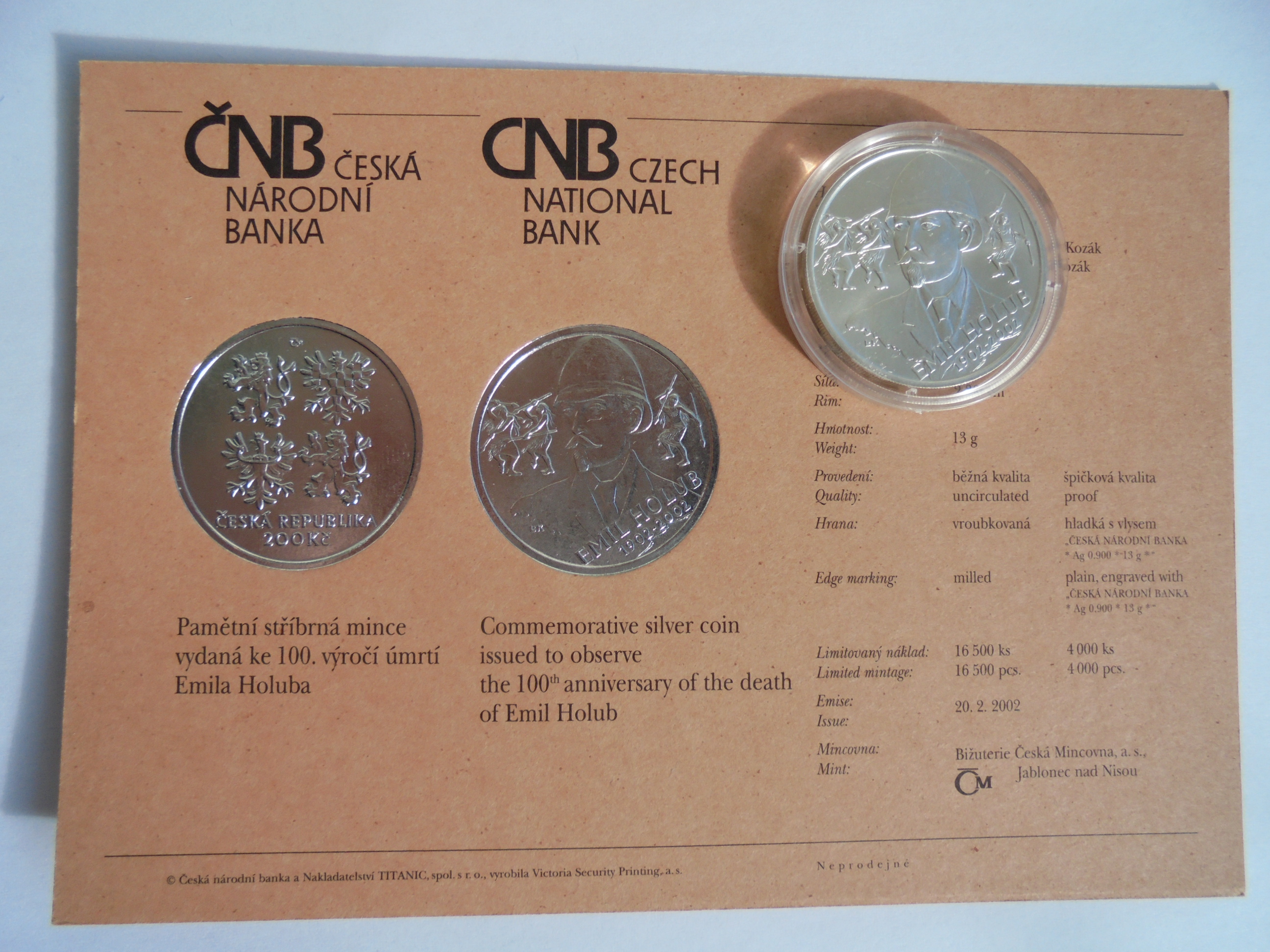 Fotografie mojí + pamětní stříbrné dvousetkoruny ke 100. výročí úmrtí Emila Holuba ( BK, běžná kvalita ).