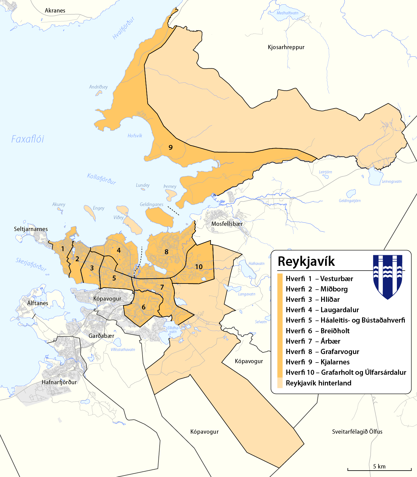 Mapa + Deutsch: Karte der Stadtteile (hverfi) von Reykjavík und der Gemeinde de:Reykjavíkurborg