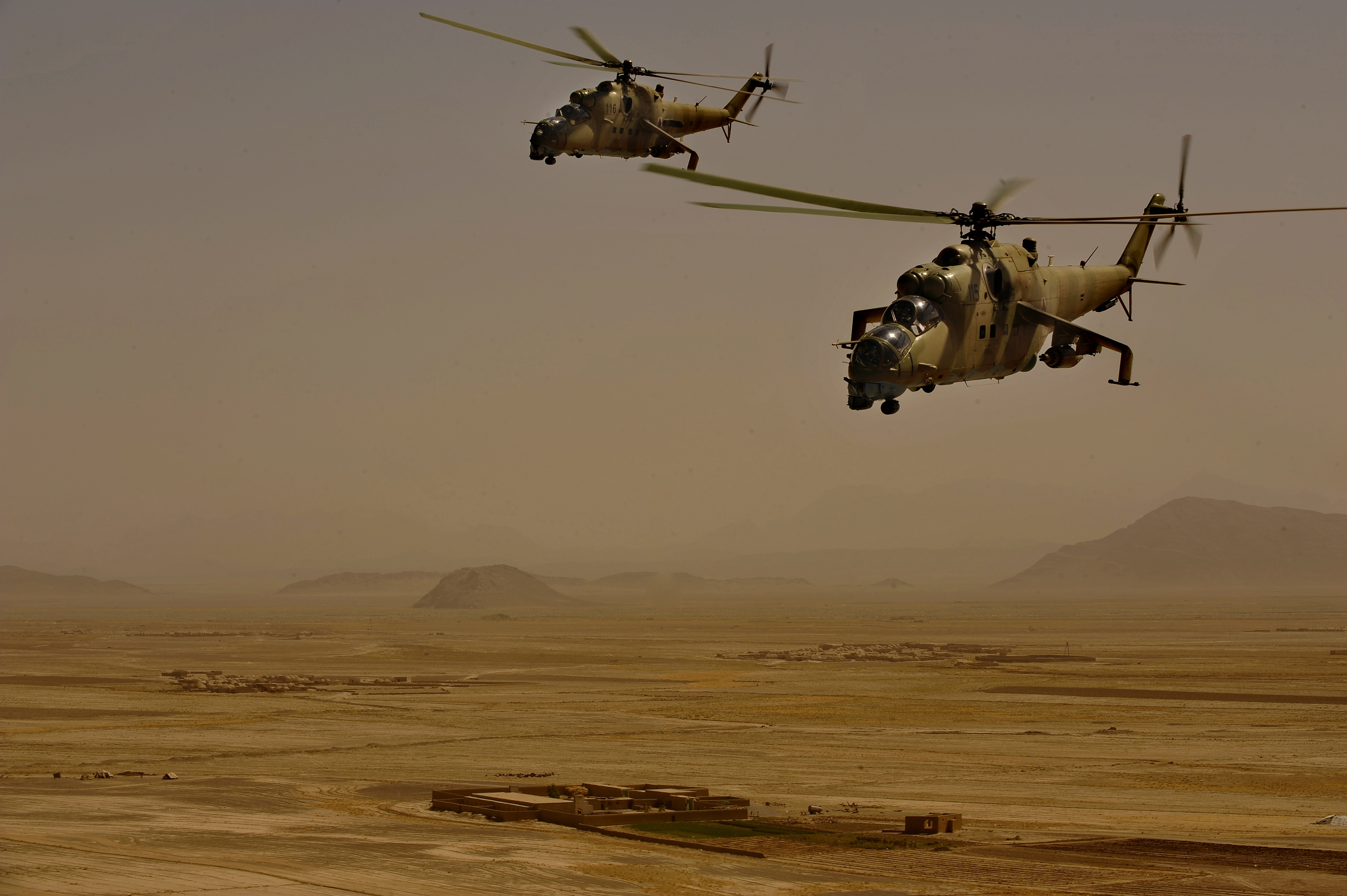 Fotografie + Afghánské Mi-35 (Afghan National Army Air Corp Airmen pilot two Mi-35 helicopters during a training sortie, with support from Czech Republic and U.S. coalition partners, over southern Afghanistan Oct. 3, 2009. (U.S. Air Force photo/Staff Sgt. Angelita Lawrence) + pochází z Wikimedia Commons, kde má status - Public domain (jako dílo federální vlády USA je tento obrázek nebo soubor volným dílem).