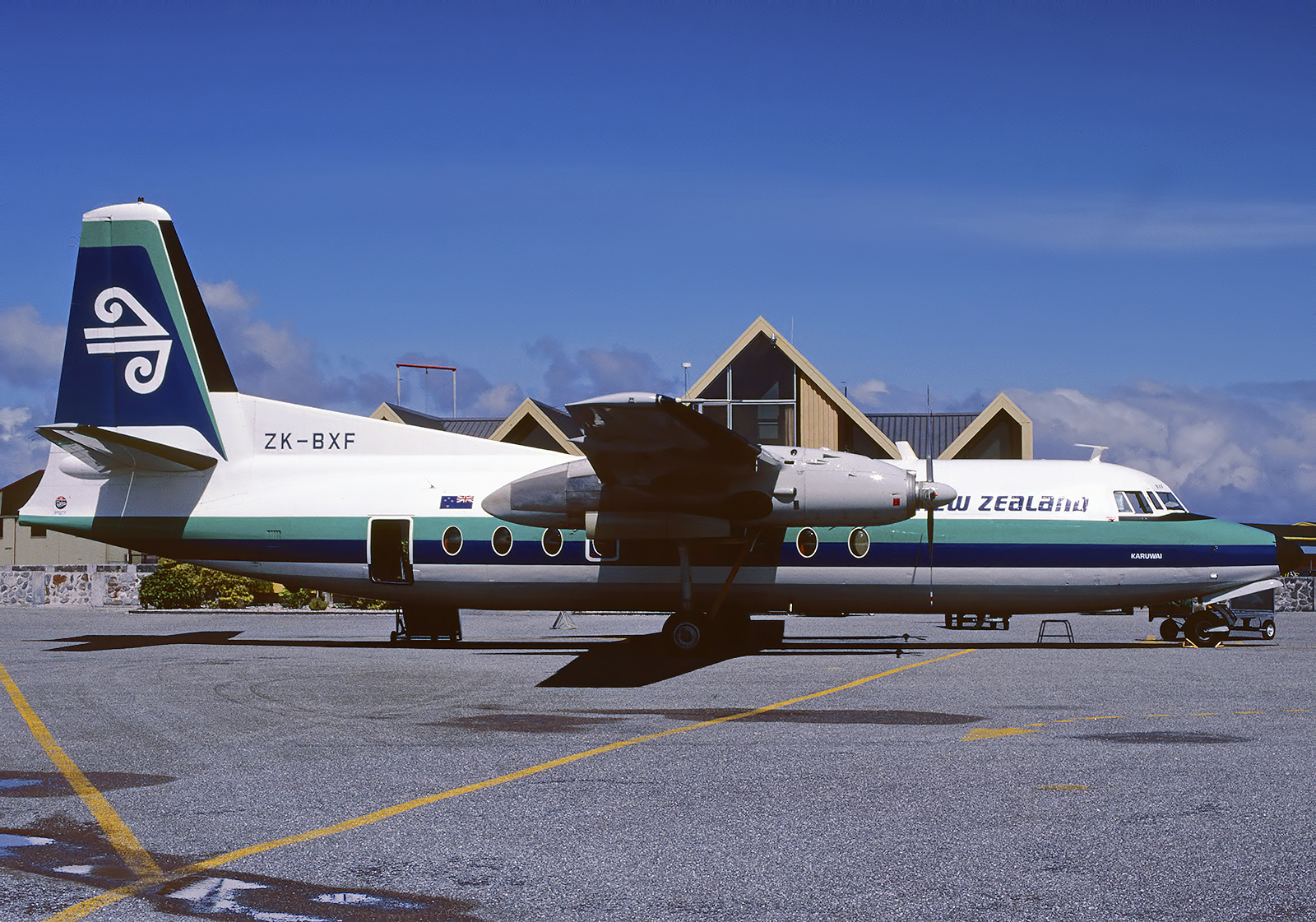 Fotografie + English: Air New Zealand Fokker F-27 100 ZK-BXF (Taken on February 27, 1988, Plustek OpticFilm 8200i)
