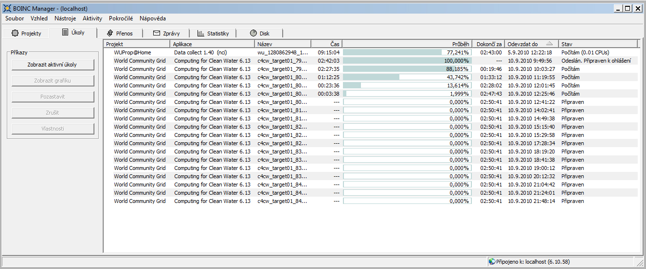 - Čeština: Okno BOINC manažera s dvěma běžícími projekty (WCG - C4CW a WUProp)