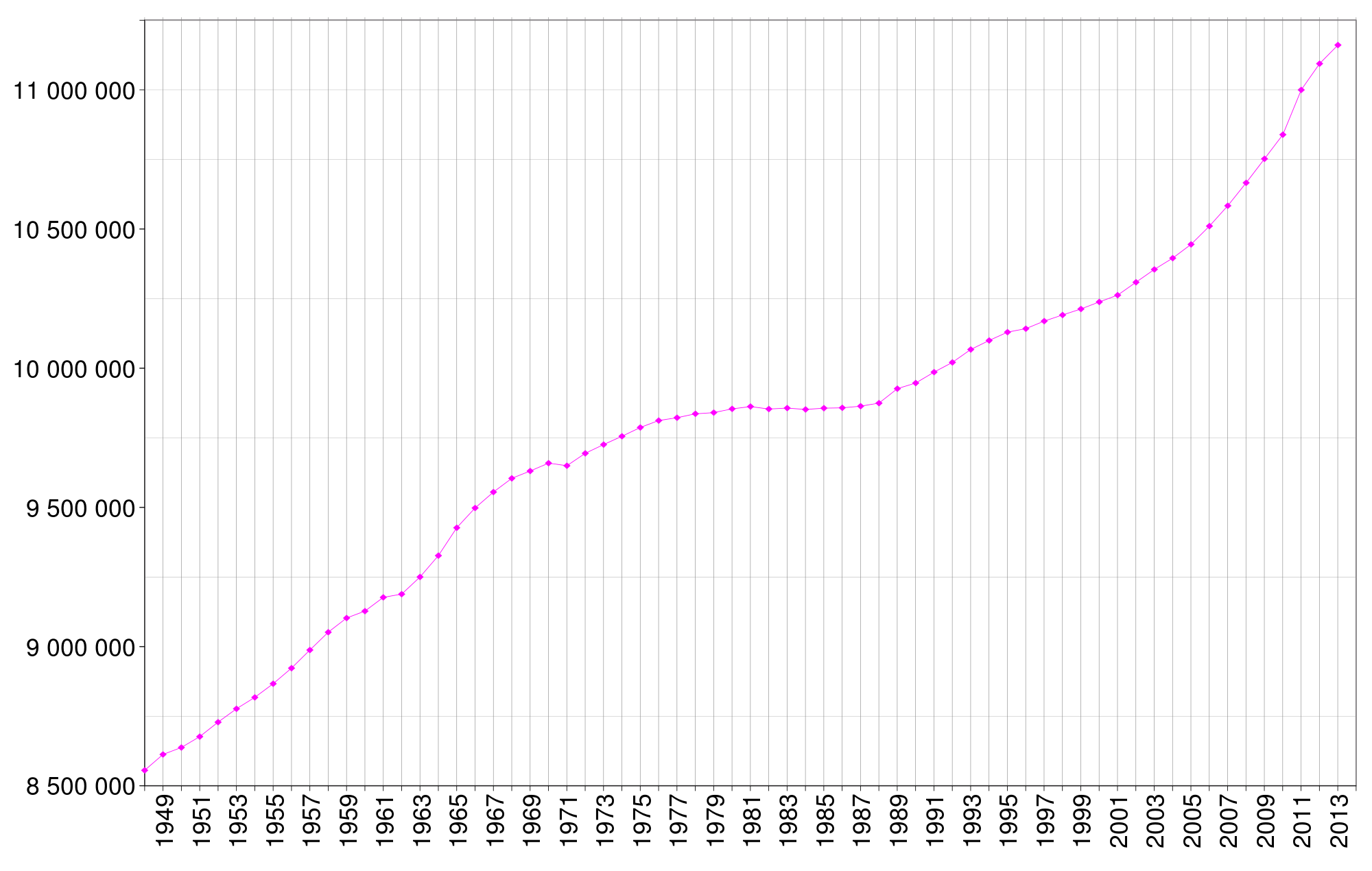- English: Belgium's population (1948-2009). Y-axis : Number of inhabitants.