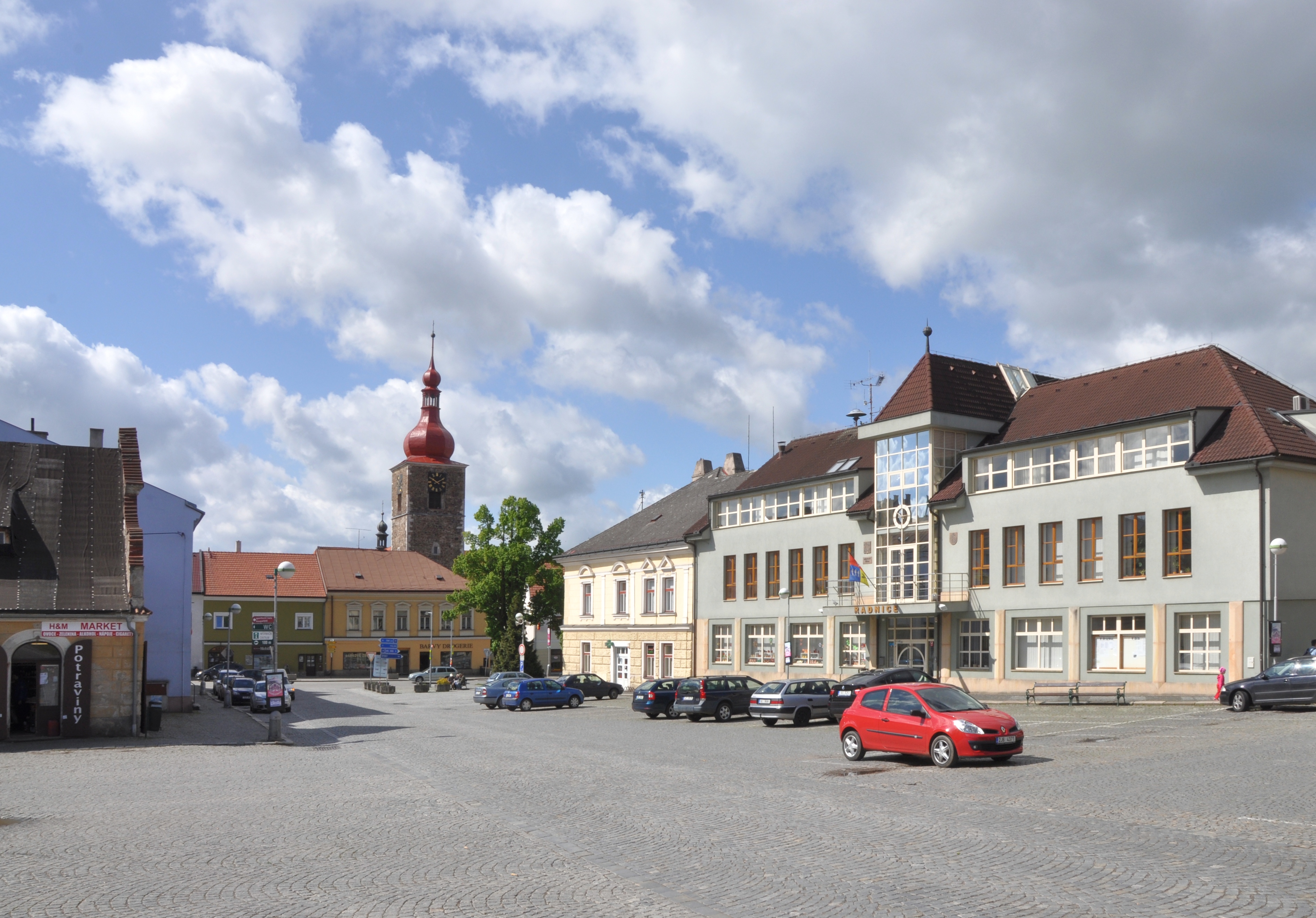 Fotografie + Description: Bechyňovo náměstí. Vpravo radnice města a v pozdí kostel Narození sv.Jana Křtitele. Město Přibyslav. Okres Havlíčkův Brod. Kraj Vysočina. Czech Republik.