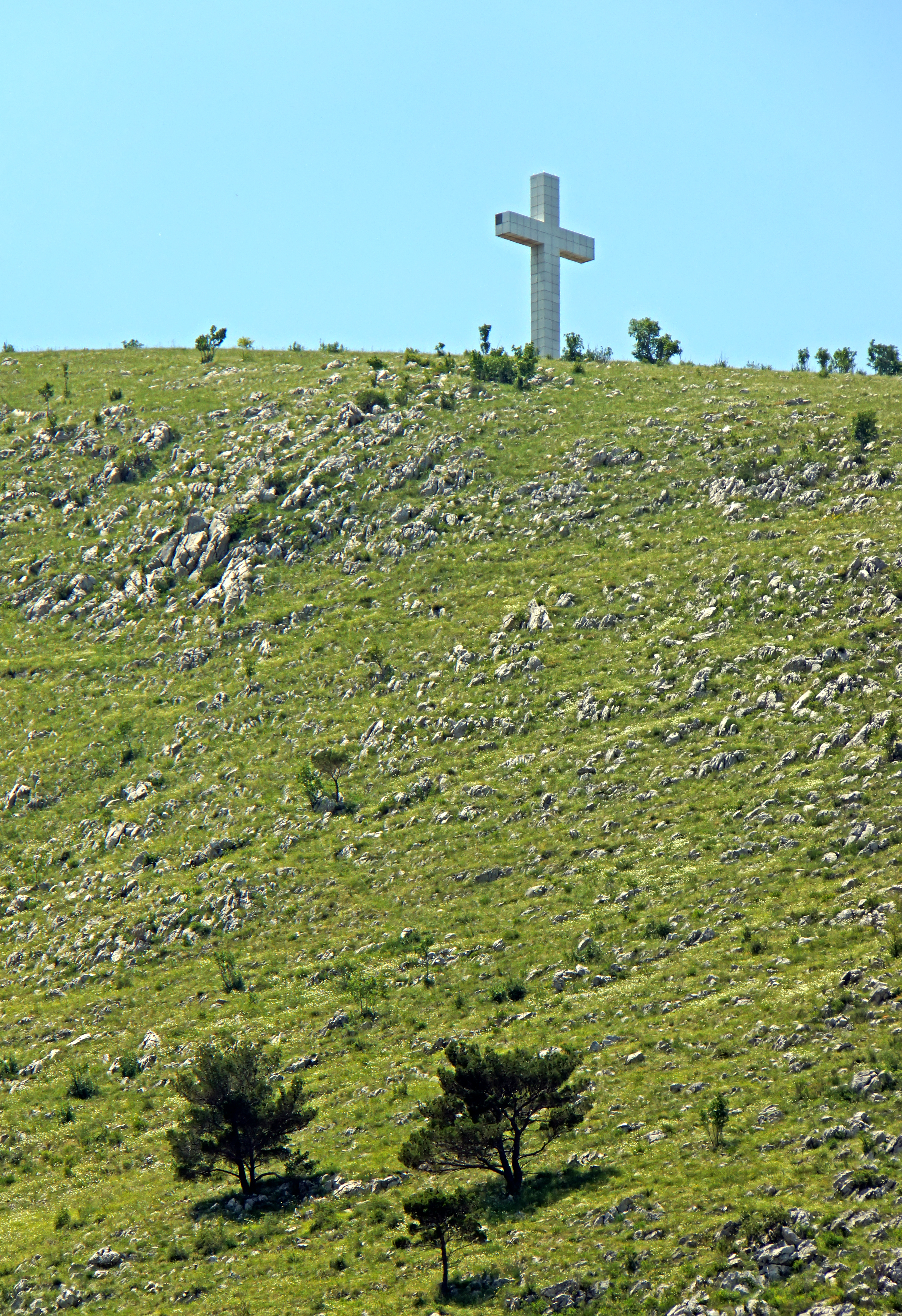 - The huge cross (33 m tall) on the Hum Hill behind the city. It seems to stand there quietly and peacefully, but nothing could be less true. The cross has been a topic for discussion ever since it was first erected in 2000. The cross is of course a religious symbol for the Catholic Croats in Mostar.