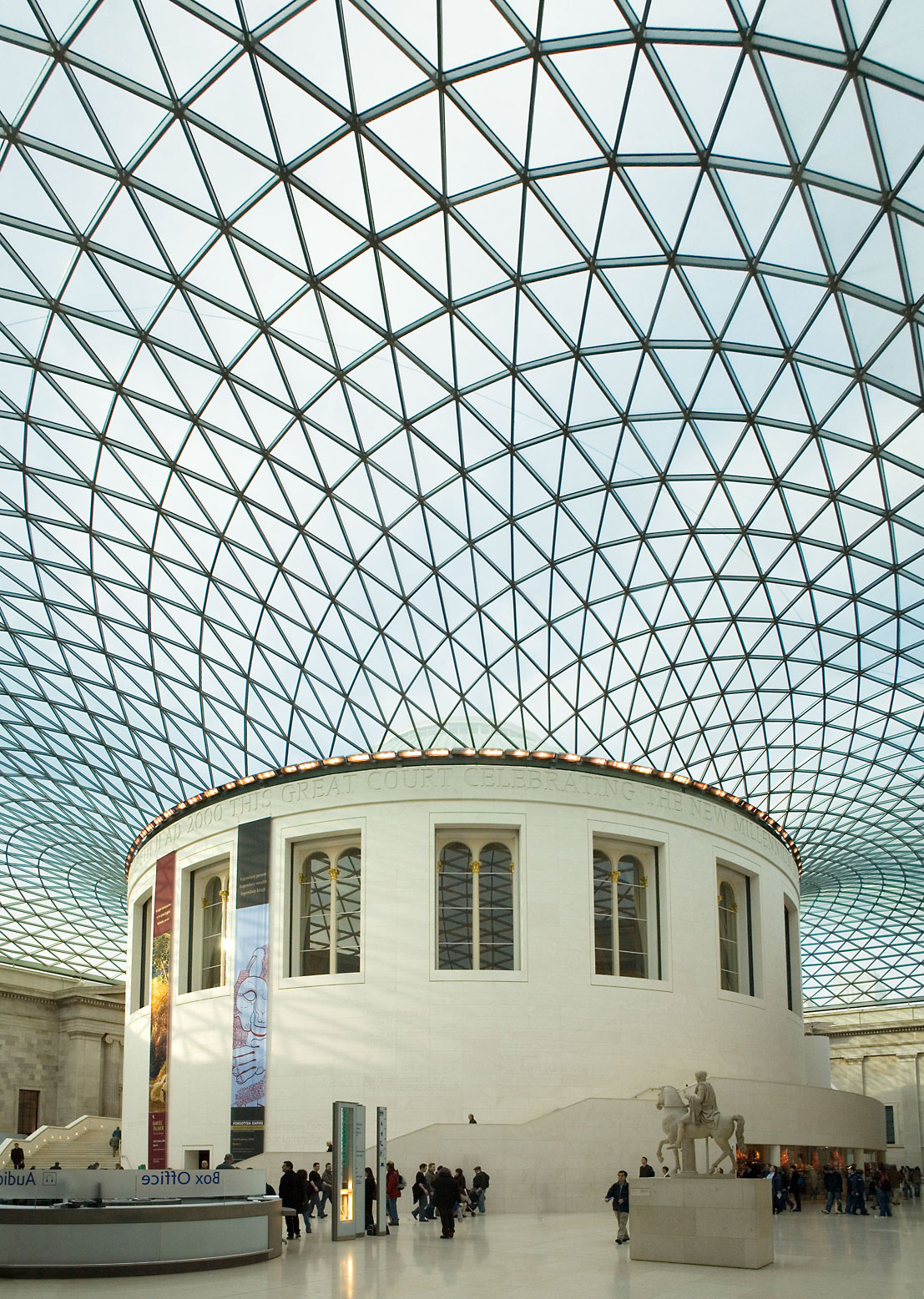 - English: The Great Court of the British Museum, with the new tessellated roof designed by Foster and Partners arching around the original, circular, Reading Room of the British Library. The sculpture on the pedestal on the right hand foreground is A youth on horseback from 1st century AD Rome.
