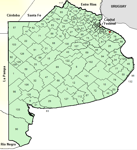 Mapa + Description: It shows administrative division of Buenos Aires province, its capital (red point) and its boundaries. This version has reference numbers for easier locating of provinces.