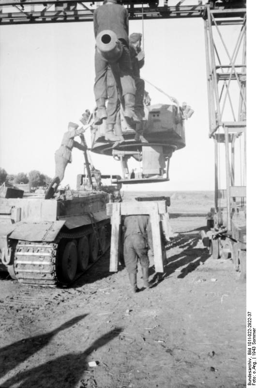 - Archive description: Sowjetunion.- Reparatur eines Panzers VI "Tiger I" (Turmreparatur) mit Kran (Frieskran / Strabokran); PK 637