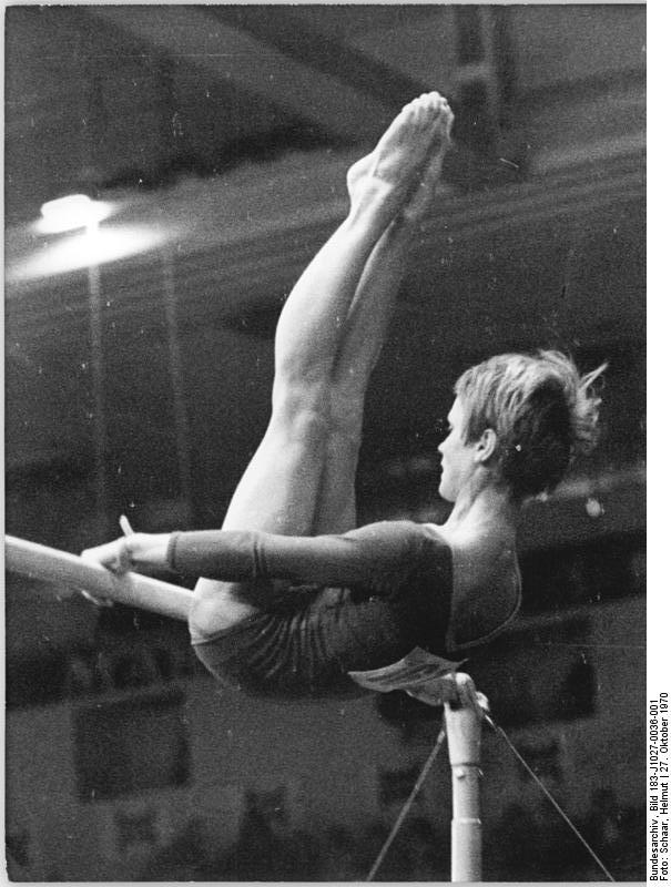 - Original caption: Zentralbild-Schaar-27.10.1970-ma-Ljubljana (Jugoslawien): XVII. Weltmeisterschaften im Turnen. Den zweiten WM-Titel für die DDR, erkämpfte bei den Final-Wettbewerben Karin Janz am Stufenbarren. Sie erhielt für ihren Kürvortrag mit 9,8 Punkten die höchste Wertung aller sechs Finalteilnehmerinnen und kam damit auf 19,55 Punkte.